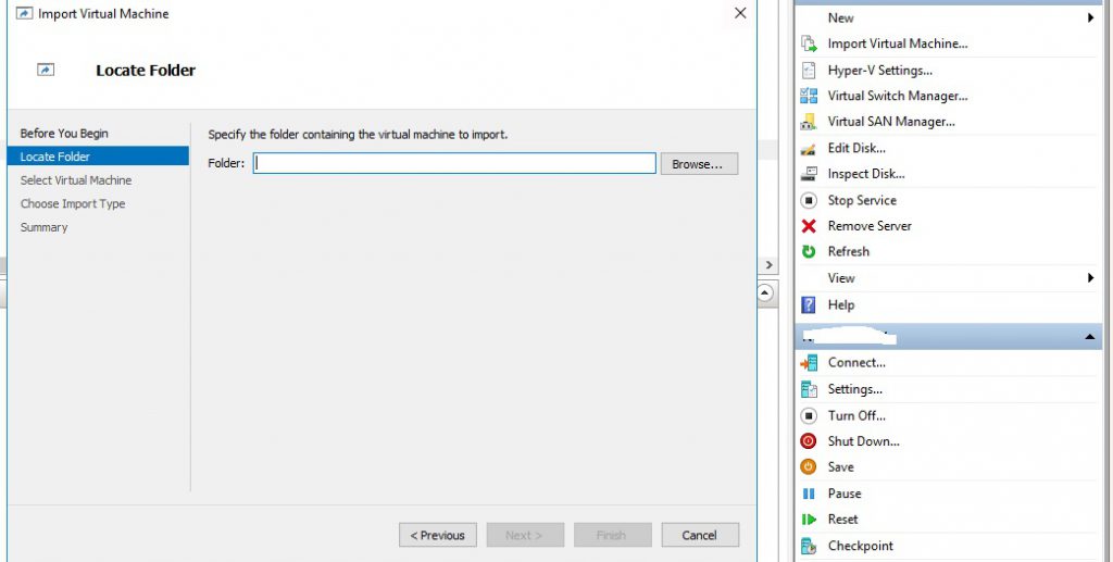 Now that the volumes are back into the cluster. And you can access the drives under c:\clusterstorage\ we need to add the VM’s back to cluster. First we go into Hyper-V manager and import the VM configuration for each VM.